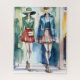 Quebra-cabeça de serra. Dois manequins vestidos da moda vestindo chapéus e mini saias caminham confiantemente em frente a um fundo colorido.
