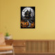 Mergulhe em um mundo assombroso com este poster de Halloween cativante! Uma mansão espectral fica enfiada nas sombras, seu encanto estranho aumentado por uma fileira de abóboras intricadamente esculpidas. Os morcegos voam contra o pano de fundo de uma lua luminosa, lançando um brilho encantador que incendeia a noite.