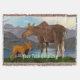 Um alce e seu bezerro bonitinho com um lago e montanhas à distância. Adicione seu próprio texto.