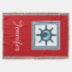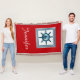 Design com temas náuticos, com decoração da cena da vela em quadrados com faixas em fundo vermelho
