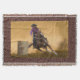 Uma vaqueira compete em torno dos tambores em um rodeio. O olhar da bordadura de couro utilizada ferramentas ele.