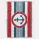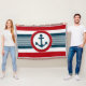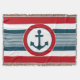 Design náutico com decoração em forma redonda com âncora sobre fundo listrado a azul, vermelho e branco
