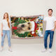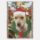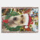 Uma pintura digital de um filhote pronto para o Natal com uma coroa, chapéu de Papai Noel e uma árvore decorada.