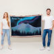 Luzes de norte roxas e azuis brilham sobre montanhas cobertas de neve em uma noite fria no Alasca. "Joyeux Noё l" aparece em azul e branco brilhantes.