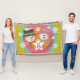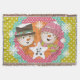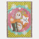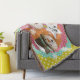 Um boné de neve com um chapéu de cima, um boneco de neve com um chapéu cor-de-rosa e cachecol listrado, um fundo de bolinhas brancas sobre mostarda, azul-aqua, rosa e laranja com uma estrela branca que você pode facilmente personalizar com seu primeiro monograma! Este bonito cobertor de Natal do boneco de neve será um item precioso ano após ano!