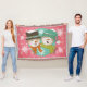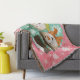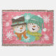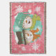 Neves Rosa e Azul jogam cobertor, tão bonito e colorido, apresenta flocos de neve brancos em fundo rosa com um círculo azul aqua com pontos brancos e cada lado tem um casal sorridente de boné, cachecol, nariz de cenoura e flocos de neve!
