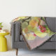 Com a aparência de um tecido de serra em padrão floral, o trabalho de arte do HomeWare neste cobertor de lama, em uma paleta pastel, é uma fotografia original de orquídeas amarelas à luz do sol da tarde. As flores das orquídeas têm pétalas amarelas e centro roxo. Um tronco verde-escuro sopra pelo centro, contra um fundo pastel de mistura cor-de-rosa em verde-claro. Algumas folhas verdes claras de uma planta isolada podem ser vistas no canto inferior esquerdo.
