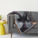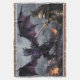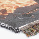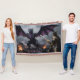 A large, dark purple dragon with massive wings faces a warrior in golden armor, who is holding a sword. The dragon is detailed with spikes and a menacing expression. The warrior is seen from the back, ready to fight. The ground is rocky and fiery, suggesting a volcanic or hellish landscape. The sky is overcast, adding to the dramatic atmosphere of the scene.