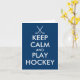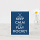 Fique calmo e jogue cartão de saudação de hóquei. Logótipo de bastões de hóquei cruzados com pinto. Cor de fundo personalizada. Cartão bonito para jogadores de hóquei no gelo e fãs.