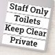 Coleção de Sinais de Quatro Portas. Somente funcionarios; Toilets; Manter Limpo; & Privado. Cor preta. Altere a redação para atender às suas necessidades.