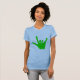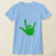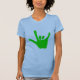 Símbolo de mão em linguagem gestual para eu te amo, feito em verde, impresso em camisetas.