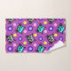 Uma toalha de mão com uma design de padrão de cinza e feltro, giro e colorido, contra um fundo violeta púrpura, com sotaques de bolinhas multicolores.
