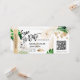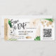 Bilhete de passagem de avião de casamento na praia de destino Dourado Salve a data com ícone de navio de cruzeiro com folhas tropicais. Adicione seu código QR