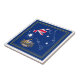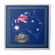 A bandeira nacional da Austrália está infundida em um mapa-esboço do país. O casaco de armas do país também está incluído e ambos estão em um fundo azul com quadros de ouro e verde para completar o design.