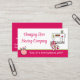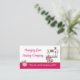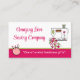 Cartão de visita de costura personalizada feita em branco, com uma faixa cor-de-rosa, na parte inferior. Uma máquina de costura de rabiscos brancos decora o canto superior direito e uma almofada de pinos está no canto inferior esquerdo. Personalize todos os campos de texto para suas necessidades comerciais. Escolha o estoque de cartão que você prefere com este design.