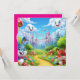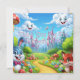 Um coelho azul amistoso com um arco vermelho sorri amplamente, cercado por flores coloridas. À sua direita, uma raposa vermelha fofa também sorri para o espectador. Ambas as personagens estão localizadas sobre um gramado verde esbranquiçado pontilhado com uma variedade de flores coloridas e cogumelos, incluindo um grande cogumelo vermelho com manchas brancas à esquerda. Uma estrada de tijolos amarelos enrolada começa do fundo da imagem e medeia através da paisagem, levando a um castelo de conto de fadas com torres cor-de-rosa à distância. O castelo está aninhado entre árvores verdes e colinas rolantes. O céu é um azul brilhante, cheio de nuvens antropomórficas e fofocas sorridentes. Um pequeno e alegre personagem semelhante ao sol e outras figuras pequenas e brincalhonas podem ser vistas também no céu. O estilo geral é brilhante, colorido e muito amigável para as crianças, evocando um senso de alegria e aventura em uma terra mágica.
