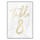 Adicione um toque de na moda à sua recepção de casamento com placas de mesa personalizadas. Os cartões de mesa de casamento apresentam um fundo de mármore branco e uma letra falsa de script de moda dourada. Números adicionais podem ser encontrados na coleção abaixo.