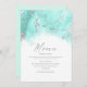 Um fundo de abstrato que lembra o mármore em tons de palha macia através do azul-aqua profundo e veinado com prata brilhante é o pano de fundo para textos elegantes e layouts modernos de design nos pedaços desta bela suíte de casamento. O menu de recepção de casamento mostrado aqui contém o texto acima mais o texto de script de fluxo opcional de 'Menu' e uma modelo para adicionar as seleções de menu, os nomes da noiva e do noivo e a data do casamento no verso. Procure ID644 para ver todas as peças de coordenação neste conjunto.