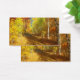 Um caminho supercrescido que percorre a floresta de pássaros em um dia ensolarado de outono. Os troncos preto e branco das árvores contrastam com folhas e gramíneas em todos os tons de ouro, de amarelo pálido a laranja profundo, iluminados pelos raios solares que passam pelos galhos.