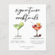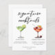 Esta ficha de cardápio de coquetéis de assinatura sofisticada apresenta uma tipografia negra simples acima de 2 das suas bebidas favoritas e seus ingredientes para o seu bar de casamento costeiro. Uma margarita chica e um desenho da Cherry French 75 adicionam um talento divertido ao seu menu de bar. Preencha com os nomes dos casais e a data para sua recepção.