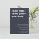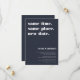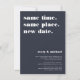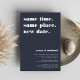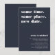 Precisa adiar ou remarcar o seu casamento? Informe os convidados com esses cartões modernos e leves em azul marinho chic com letras brancas. O design engraçado e inteligente baseado em tipografia apresenta "mesmo horário, mesmo local, nova data" no topo com a nova data do casamento e detalhes abaixo.