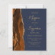 A borda esquerda deste elegante convite de casamento moderno apresenta uma cor de água laranja queimada, aparada com falsa brilho dourado. O texto personalizável combina o script dourado e as fontes sans serif em um fundo azul marinho escuro. O verso apresenta uma design de cor laranja queimada e dourada.