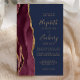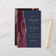 A borda esquerda deste elegante convite de casamento moderno apresenta uma cor vermelha e borrifada, com uma falsa brilha de ouro. O texto personalizável combina manuscrito dourado, fontes em copperplate e itálico em um fundo azul marinho. O design de agata burgundy é repetido na parte de trás do cartão.