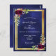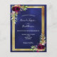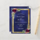 Um convite para casamento moderno e moderno. Um fundo azul escuro, azul marinho. A cor azul é irregular. Com uma falso armação de ouro e florais impermeáveis, flores com verde. Modelos para seus nomes e informações sobre cerimônias. Os nomes são escritos com um moderno estilo escrito à mão. Fundo: fundo azul escuro. Este cartão também está disponível em nossa loja sem o fundo azul no verso.