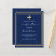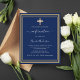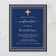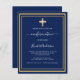 Um moderno, elegante e convite. Um fundo azul marinho decorado com uma cruz ouro e quadros. Personalize e adicione um nome e detalhes. Texto branco. 1 folha = 1 convite impresso de borda a borda.