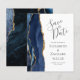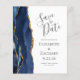 A borda esquerda deste elegante casamento moderno salve o cartão de data apresenta uma marinho azul de aquarela agata borda aparada com falso brilho dourado. O texto personalizável combina a escrita manual de cinzas de carvão, as fontes em copperplate e itálico em um fundo branco. O verso apresenta um design azul-marinho e um agate-ouro correspondentes.