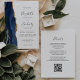 A borda esquerda deste elegante convite de casamento moderno apresenta um marinho azul de aquarela agata borda aparada com falso brilho dourado. O texto personalizável combina manuscrito, copperplate e fontes itálicas em cinzas de carvão em um fundo branco. O verso fornece espaço para detalhes do casamento em um fundo branco sólido, junto com um código QR que os convidados podem digitalizar para visitar seu site e RSVP, o que economiza o custo de imprimir e enviar cartões RSVP separados.