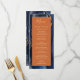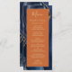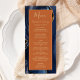 Este elegante e moderno menu de casamento mostra um marinho azul de aquarela com o fundo de agata aparado com brilho dourado. O texto aparece em letras elegantes douradas e fontes em placas em um retângulo laranja queimado. O design de ágata é repetido no reverso.