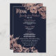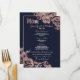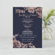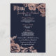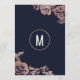 Flores de ouro rosa e tipografia elegantes, quentes e simples e modernas imprimidas em fundo azul marinho, cartões de menu de recepção de casamento. Este design clássico e sofisticado é perfeito para a recepção de casamento clássica, na moda e de tendências. Personalize com seu próprio menu na frente, junto com seus nomes e datas. Então personalize o dorso com seu monograma inicial. Todas as impressão de fotos.