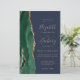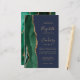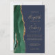 A borda esquerda deste elegante convite de casamento moderno apresenta uma esmeralda verde aquarela agate borda com falsa brilho dourado. O texto personalizável combina manuscrito dourado, fontes em copperplate e itálico em um fundo azul marinho. O verso apresenta um design emerald verde e dourado.