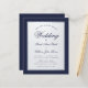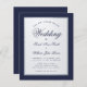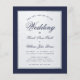 Um convite de casamento de orçamento clássico. Ele tem um quadro retangular marinho azul e falso prateado e texto azul marinho sobre fundo branco. As palavras Casamento e os nomes são escritos em uma escrita caligráfica elegante.