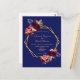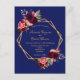 Na frente: Um convite de casamento moderno e moderno. Um fundo azul marinho com uma estrutura geométrica falsa dourada. Decorados com flores, rosas e penas do estilo "boho" escuras e burguesas. Modelos para seus nomes e detalhes do casamento. Os nomes são escritos com um script de estilo manuscrito, letras ouros coloridas. Fundo branco.