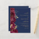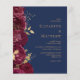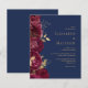 Este convite romântico de casamento floral mostra uma fronteira de flores de burgundy disparadas com folhas de folhas falsas de ouro. Os nomes do casal aparecem em fontes clássicas de serifa dourada, com o texto restante em itálico, em um fundo azul marinho.