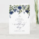 Cartão de Saudação do Dia do Casamento - Marinho Azul Flores Selvagens: Este parabéns azul do dia do casamento apresenta flores azuis escuras e verdes penduradas no topo. Diz "à noiva e ao noivo no dia do casamento". Você pode personalizar os nomes dos casais e a data do casamento e as informações da coroa no verso.
