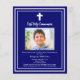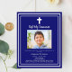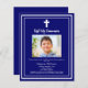 Um fundo azul marinho, decorado com uma estrutura branca, e uma cruz branca Personalize e adicione um nome de foto e detalhes. Texto branco. 1 folha = 1 convite impresso de borda a borda.