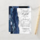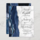 A borda esquerda deste elegante convite de casamento moderno apresenta um marinho azul de aquarela agata bordada com falso brilho prateado. O texto personalizável combina manuscrito preto, fontes em copperplate e itálico em uma cinza e fundo de mármore branco. O verso apresenta um design azul marinho e agate prateado correspondentes.
