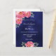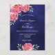 Um convite para casamento moderno e moderno. Um fundo azul escuro e marinho azul. A cor azul é irregular. Decorados com flores, florais e verde de cinzas, cor-de-rosa, ligeiramente amareladas. Modelos para seus nomes e informações sobre cerimônias. Os nomes são escritos com um moderno estilo escrito à mão. Texto branco. Traseira: design de cartão postal simples.