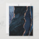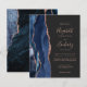 A borda esquerda deste elegante convite de casamento moderno apresenta um marinho azul de aquarela agate bordado com falso brilho rosa de ouro. O texto personalizável combina manuscrito de rosa, fontes em copperplate e itálico em um fundo de cinza de carvão escuro. O verso apresenta um design marinho de agate azul e rosa dourado correspondente.