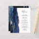A borda esquerda deste elegante cardápio moderno de casamento apresenta uma marinho azul de aquarela agata bordada com falso brilho rosa de ouro. O texto personalizável combina o script de escrita manual e as fontes de impressão em cinzas de carvão em um fundo branco. O verso apresenta um design marinho de agate azul e rosa dourado correspondente.