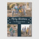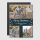 Cartões de Natal felizes com fotos com colagem de fotos, com três (3) imagens, tipografia de script branco e borda prateada com floco de neve, contra o fundo azul clássico do marinho. Personalize facilmente com suas fotos, cores e texto favoritos. Crédito fotográfico Fotografia © Storytree Studios, Stanford, CA.