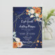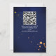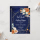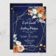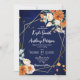 Banheira laranja e branca, eucalipto verde marinho azul de fundo ouro geométrico convite de casamento floral com código QR RSVP no verso.