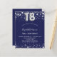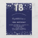 Um convite moderno, na moda e glamouroso para uma 18ª festa de aniversário. Um fundo azul marinho, decorado com estrelas de falso prata. Personalize e adicione seu nome e detalhes da festa. O número 18 é escrito com uma fonte no estilo do balão. 1 folha = 1 convite impresso de borda a borda.