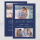 Esta simples e minimalista placa Save the Date apresenta uma fotografia horizontal na parte superior e duas fotos quadradas na parte inferior. No meio, as palavras "Salvar a Data" aparecem no elegante guião branco, seguido dos nomes do casal, da data do casamento e da cidade em sans serif em um fundo azul marinho. Adicione uma quarta foto horizontal ao verso, juntamente com uma mensagem mais detalhada com informações adicionais.