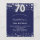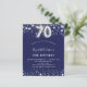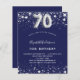 Um convite moderno, na moda e glamouroso para uma festa de aniversário 70. Um fundo azul marinho, decorado com estrelas de falso prata. Personalize e adicione seu nome e detalhes da festa. O número 70 é escrito com uma fonte no estilo do balão.