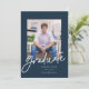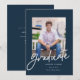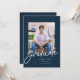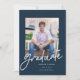 Anúncio de graduação com um roteiro moderno com fundo de marinho. O verso permite uma formulação adicional, que poderia dobrar como convite.