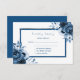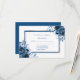Um cartão RSVP elegante para um casamento com modelos para resposta por data e nomes. Um falso quadro prateado e azul clássico com flores impermeáveis, rosas em tons de azul. Um fundo branco chic, texto azul na frente. Fundo: fundo azul clássico, letras brancas.